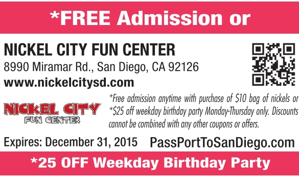 *Free admission anytime with purchase of $10 bag of nickels or *$25 off weekday birthday party Monday-Thursday only. Discounts cannot be combined with any other coupons or offers.