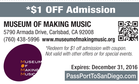 (760) 438-5996 www.museumofmakingmusic.org *Redeem for $1 off admission with coupon. Not valid with other offers or for special events.