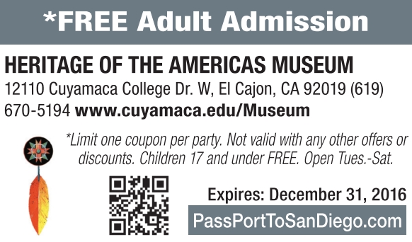 *FREE Adult Admission HERITAGE OF THE AMERICAS MUSEUM 12110 Cuyamaca College Dr. W, El Cajon, CA 92019 (619) 670-5194 www.cuyamaca.edu/Museum *Limit one coupon per party. Not valid with any other offers or discounts. Children 17 and under FREE. Open Tues.-Sat. Expires: December 31, 2016 PassPortToSanDiego.com