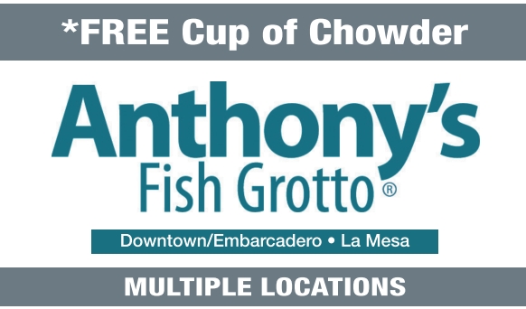 9530 Murray Dr., La Mesa, CA 91942 (619) 463-0368 *One FREE cup of Anthony’s world-famous Clam Chowder with the purchase of any adult entrée. Coupon valid for up to 4 people. Cannot be combined with any other offer or discount. Valid at all locations. www.gofishanthonys.com Expires: December 31, 2016 PassPortToSanDiego.com