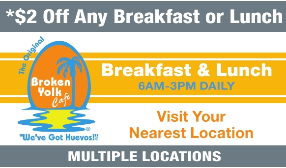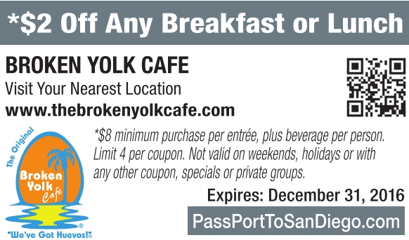 www.thebrokenyolkcafe.com *$8 minimum purchase per entrée, plus beverage per person. Limit 4 per coupon. Not valid on weekends, holidays or with any other coupon, specials or private groups.
