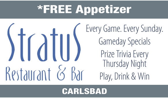 2725 Palomar Airport Rd, Carlsbad 92009 760-795-1037 stratuscarlsbad.com *Redeem this coupon for a FREE appetizer with purchase of any entrée and beverage. Limit one coupon per table. Not to be combined with any other offers. Expires: December 31, 2016 PassPortToSanDiego.com