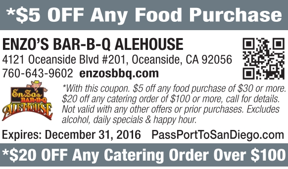 760-643-9602 enzosbbq.com *With this coupon. $5 off any food purchase of $30 or more. $20 off any catering order of $100 or more, call for details. Not valid with any other offers or prior purchases. Excludes alcohol, daily specials & happy hour.