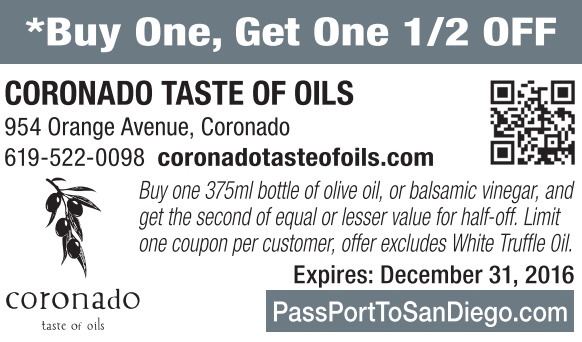 954 Orange Avenue, Coronado 619-522-0098 coronadotasteofoils.com Buy one 375ml bottle of olive oil, or balsamic vinegar, and get the second of equal or lesser value for half-off. Limit one coupon per customer, offer excludes White Truffle 0il. Expires: December 31, 2016 PassPortToSanDiego.com