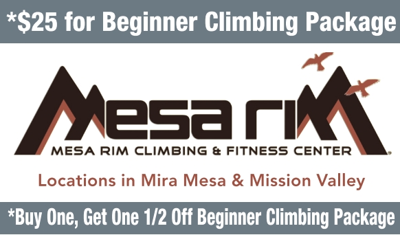 Mission Valley: 405 Camino Del Rio S. • 619.908.1611 *Redeem coupon for a $25 Beginner Climbing Package (includes a day pass, gear and belay lesson) OR Buy One, Get One 1/2 Off Beginner Climbing Package (one coupon