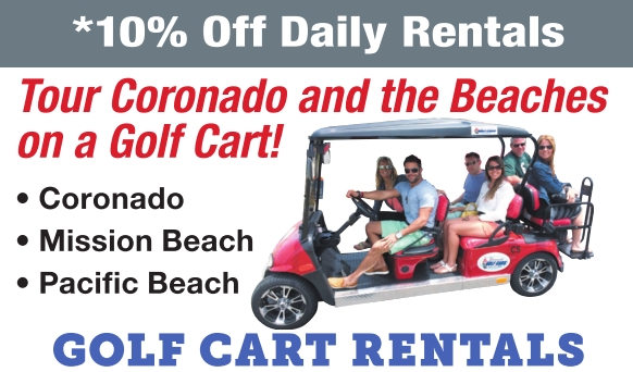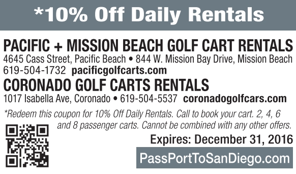 4645 Cass Street, Pacific Beach • 844 W. Mission Bay Drive, Mission Beach 619-504-1732 pacificgolfcarts.com coronado golf carts rentals 1017 Isabella Ave, Coronado • 619-504-5537 coronadogolfcars.com *Redeem this coupon for 10% Off Daily Rentals. Call to book your cart. 2, 4, 6 and 8 passenger carts. Cannot be combined with any other offers. Expires: December 31, 2016 PassPortToSanDiego.com