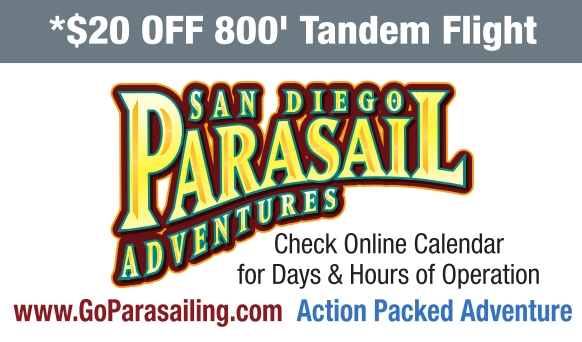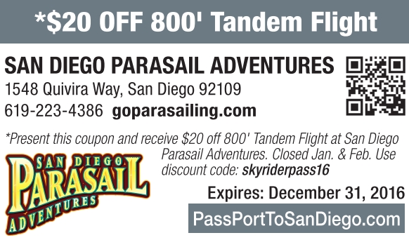 619-223-4386 goparasailing.com *Present this coupon and receive $20 off 800' Tandem Flight at San Diego Parasail Adventures. Closed Jan. & Feb. Use discount code: skyriderpass16 Expires: December 31, 2016 PassPortToSanDiego.com