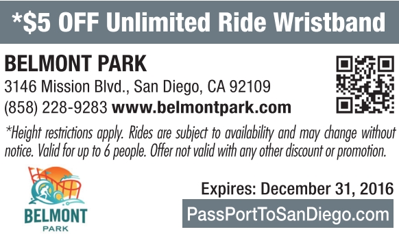 (858) 228-9283 www.belmontpark.com *Height restrictions apply. Rides are subject to availability and may change without notice. Valid for up to 6 people. Offer not valid with any other discount or promotion.