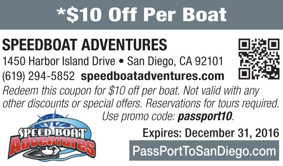 1450 Harbor Island Drive • San Diego, CA 92101 (619) 294-5852 speedboatadventures.com Redeem this coupon for $10 off per boat. Not valid with any other discounts or special offers. Reservations for tours required. Use promo code: passport10. Expires: December 31, 2016 PassPortToSanDiego.com