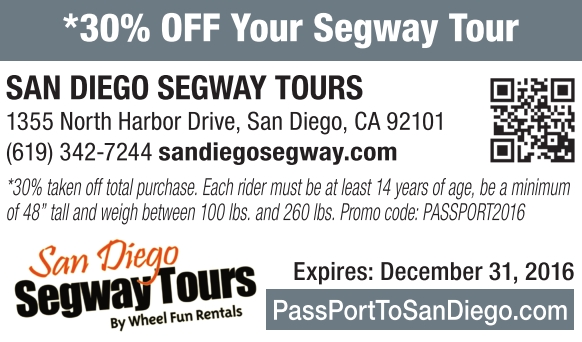 (619) 342-7244 sandiegosegway.com *30% taken off total purchase. Each rider must be at least 14 years of age, be a minimum of 48” tall and weigh between 100 lbs. and 260 lbs. Promo code: PASSPORT2016