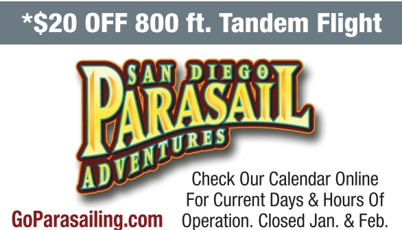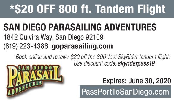 *$20 OFF 800 ft. Tandem Flight SAN DIEGO PARASAILING ADVENTURES 1842 Quivira Way, San Diego 92109 (619) 223-4386 goparasailing.com *Book online and receive $20 off the 800-foot SkyRider tandem flight. Use discount code: skyriderpass19 Expires: June 30, 2020 PassPortToSanDiego.com