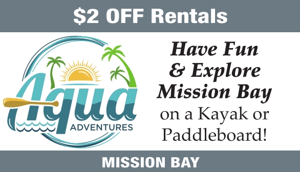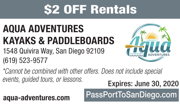 $2 OFF Rentals AQUA ADVENTURES KAYAKS & PADDLEBOARDS 1548 Quivira Way, San Diego 92109 (619) 523-9577 *Cannot be combined with other offers. Does not include special events, guided tours, or lessons. Expires: June 30, 2020 aqua-adventures.com PassPortToSanDiego.com