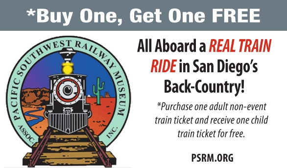 *Buy One, Get One FREE PACIFIC SOUTHWEST RAILROAD MUSEUM 750 Depot St., Campo, CA 91906 (619) 465-7776 (recorded information line) psrm.org *Purchase one adult non-event train ticket and receive one child train ticket for free. This offer is not available online and is good for Golden State or Valley Flyer Train Rides. Expires: June 30, 2020 PassPortToSanDiego.com