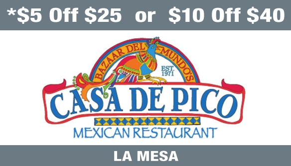 *$5 Off $25 or $10 Off $40 CASA DE PICO MEXICAN RESTAURANT 5500 Grossmont Center Dr., La Mesa, CA 91942 (619) 463-3267 casadepico.com *Limit one coupon per table. Not valid with any other offer, promotion, happy hour pricing, or for the purchase of gift cards. Gratuity and/or sales tax may not be included to reach minimum purchase amount. Original coupons only. No cash value. No cash back. Expires: June 30, 2020 PassPortToSanDiego.com