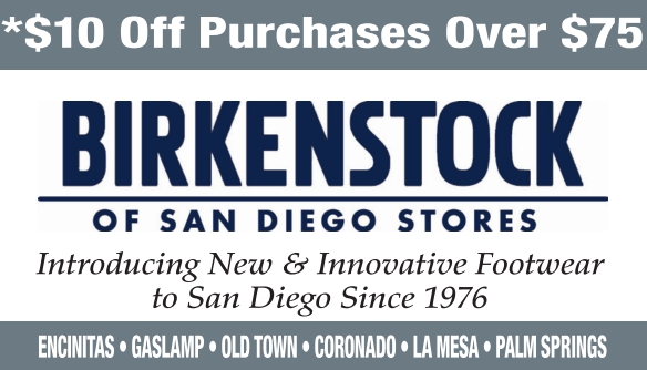 *$10 Off Purchases Over $75 BIRKENSTOCK OF SAN DIEGO STORES (6 LOCATIONS) Encinitas • Gaslamp • Old Town Coronado • La Mesa • Palm Springs **Receive $10 off your purchase of $75 or more. Must present coupon at time of purchase. Managers hold full discretion of the use of this coupon. Cannot be combined with any other offers. birkenstocksd.com