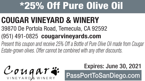 Present this coupon and receive 25% Off a Bottle of Pure Olive Oil made from Cougar Estate-grown olives. Offer cannot be combined with any other discounts.