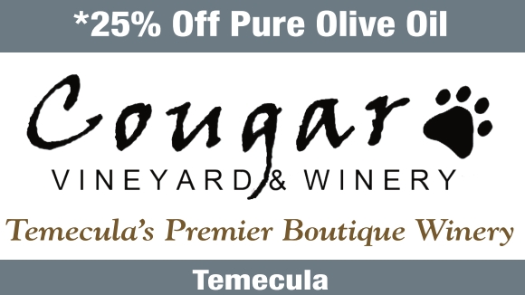 *25% Off Pure Olive Oil COUGAR VINEYARD & WINERY 39870 De Portola Road, Temecula, CA 92592 (951) 491-0825 cougarvineyards.com Present this coupon and receive 25% Off a Bottle of Pure Olive Oil made from Cougar Estate-grown olives. Offer cannot be combined with any other discounts. Expires: June 30, 2021 PassPortToSanDiego.com
