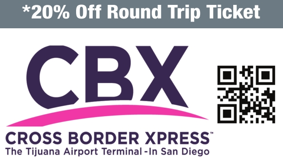*20% Off Round Trip Ticket CROSS BORDER XPRESS (CBX) 2745 Otay Pacific Drive, San Diego 92154 (619) 207-0472 crossborderxpress.com *Scan the QR Code or use PROMOCODE P2SDCBX to redeem this offer.Valid online or at CBX counters. Not valid with any other offer or product. Limited to 1 coupon per customer. Block Out Dates: 03/05/21-03/14/21 Valid 01/15/21 through 05/31/21