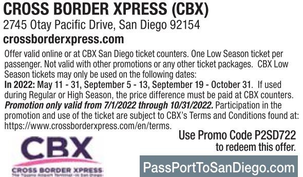 CROSS BORDER XPRESS (CBX) 2745 Otay Pacific Drive, San Diego 92154 crossborderxpress.com Offer valid online or at CBX San Diego ticket counters. One Low Season ticket per passenger. Not valid with other promotions or any other ticket packages. CBX Low Season tickets may only be used on the following dates: In 2022: May 11 - 31, September 5 - 13, September 19 - October 31. If used during Regular or High Season, the price difference must be paid at CBX counters. Promotion only valid from 7/1/2022 through 10/31/2022. Participation in the promotion and use of the ticket are subject to CBX’s Terms and Conditions found at: https://www.crossborderxpress.com/en/terms. Use Promo Code P2SD722 to redeem this offer. PassPortToSanDiego.com