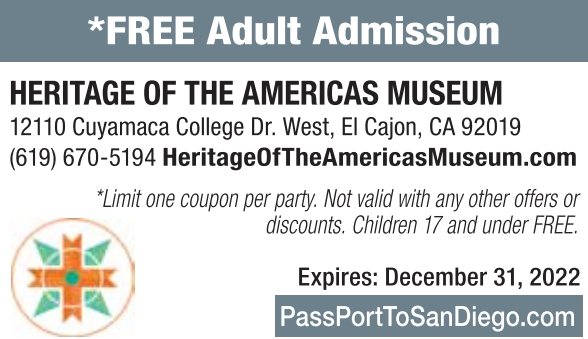 *FREE Adult Admission HERITAGE OF THE AMERICAS MUSEUM 12110 Cuyamaca College Dr. West, El Cajon, CA 92019 (619) 670-5194 HeritageOfTheAmericasMuseum.com *Limit one coupon per party. Not valid with any other offers or discounts. Children 17 and under FREE. Expires: December 31, 2022 PassPortToSanDiego.com