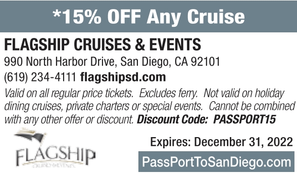 *15% OFF Any Cruise FLAGSHIP CRUISES & EVENTS 990 North Harbor Drive, San Diego, CA 92101 (619) 234-4111 flagshipsd.com Valid on all regular price tickets. Excludes ferry. Not valid on holiday dining cruises, private charters or special events. Cannot be combined with any other offer or discount. Discount Code: PASSPORT15 Expires: December 31, 2022 PassPortToSanDiego.com