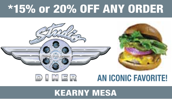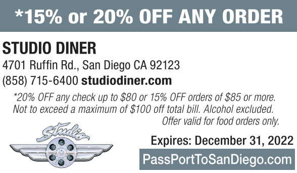 *15% or 20% OFF ANY ORDER STUDIO DINER 4701 Ruffin Rd., San Diego CA 92123 (858) 715-6400 studiodiner.com *20% OFF any check up to $80 or 15% OFF orders of $85 or more. Not to exceed a maximum of $100 off total bill. Alcohol excluded. Offer valid for food orders only. Expires: December 31, 2022 PassPortToSanDiego.com