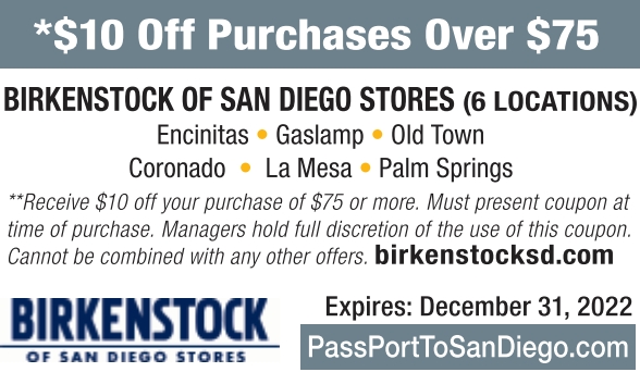 *$10 Off Purchases Over $75 BIRKENSTOCK OF SAN DIEGO STORES (6 LOCATIONS) Encinitas • Gaslamp • Old Town Coronado • La Mesa • Palm Springs **Receive $10 off your purchase of $75 or more. Must present coupon at time of purchase. Managers hold full discretion of the use of this coupon. Cannot be combined with any other offers. birkenstocksd.com Expires: December 31, 2022 PassPortToSanDiego.com
