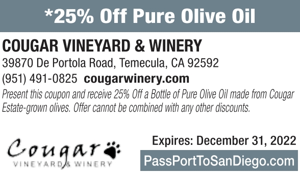 Present this coupon and receive 25% Off a Bottle of Pure Olive Oil made from Cougar Estate-grown olives. Offer cannot be combined with any other discounts.