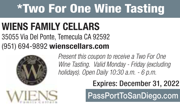 *Two *FREE For One Admission Wine Tasting WIENS FAMILY CELLARS 35055 Via Del Ponte, Temecula CA 92592 (951) 694-9892 wienscellars.com Present this coupon to receive a Two For One Wine Tasting. Valid Monday - Friday (excluding holidays). Open Daily 10:30 a.m. - 6 p.m. Expires: December 31, 2022 PassPortToSanDiego.com