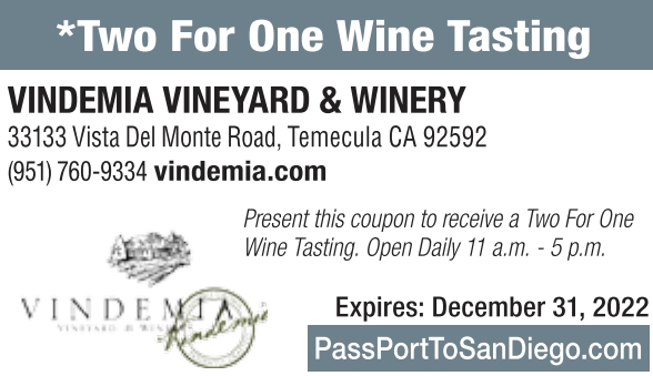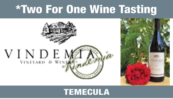 *Two For One Wine Tasting VINDEMIA VINEYARD & WINERY 33133 Vista Del Monte Road, Temecula CA 92592 (951) 760-9334 vindemia.com Present this coupon to receive a Two For One Wine Tasting. Open Daily 11 a.m. - 5 p.m. Expires: December 31, 2022
