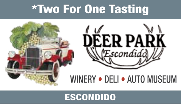 *Two For One Wine Tasting DEER PARK WINERY & AUTO MUSEUM 29013 Champagne Blvd., Escondido CA 92026 (760) 749-1666 deerparkwine.com Present this coupon to receive a Two For One Wine or Champagne Tasting. Open at 10am Thurs. - Sunday. Winery • Deli • Auto Museum Expires: December 31, 2022 PassPortToSanDiego.com