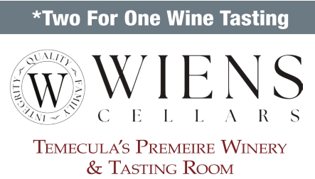 *Two For One Wine Tasting WIENS FAMILY CELLARS35055 Via Del Ponte, Temecula CA 92592 (951) 694-9892 wienscellars.com Present this coupon to receive a Two for One Wine Tasting. Valid Monday – Sunday (excluding holidays). Open daily 10:30 a.m. – 6 p.m. Expires: December 31, 2023 PassPortToSanDiego.com
