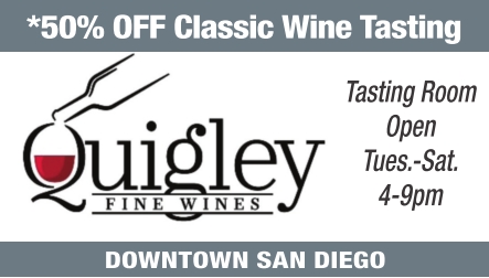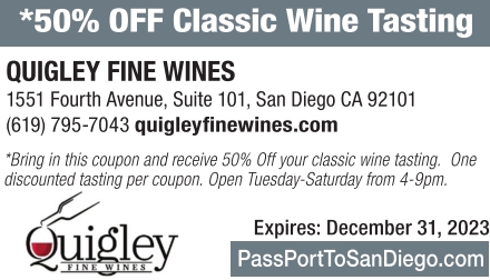 *50% OFF Classic Wine Tasting QUIGLEY FINE WINES 1551 Fourth Avenue, Suite 101, San Diego CA 92101 (619) 795-7043 quigleyfinewines.com *Bring in this coupon and receive 50% Off your classic wine tasting. One discounted tasting per coupon. Open Tuesday-Saturday from 4-9pm. Expires: December 31, 2023 PassPortToSanDiego.com