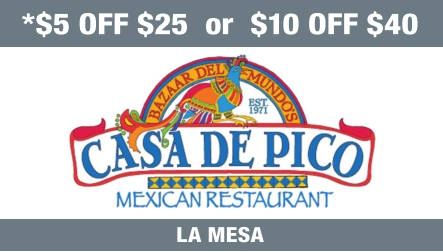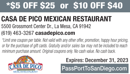 *$5 OFF $25 or $10 OFF $40 CASA DE PICO MEXICAN RESTAURANT 5500 Grossmont Center Dr., La Mesa, CA 91942 (619) 463-3267 casadepico.com *Limit one coupon per table. Not valid with any other offer, promotion, happy hour pricing, or for the purchase of gift cards. Gratuity and/or sales tax may not be included to reach minimum purchase amount. Original coupons only. No cash value. No cash back. Expires: December 31, 2023 PassPortToSanDiego.com