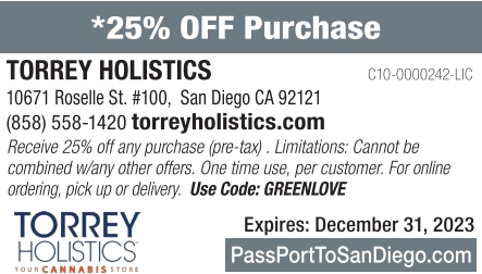 *25% OFF Purchase TORREY HOLISTICS 10671 Roselle St. #100, San Diego CA 92121 (858) 558-1420 torreyholistics.com Receive 25% off any purchase (pre-tax). Limitations: Cannot be combined w/any other offers. One time use, per customer. For online ordering, pick up or delivery. Use Code: GREENLOVE Expires: December 31, 2023 PassPortToSanDiego.com