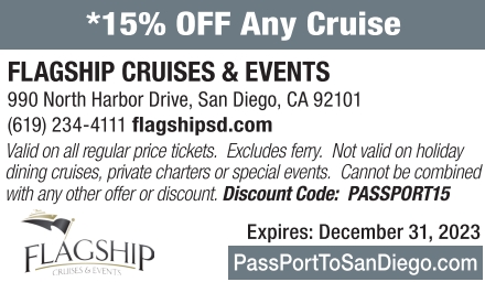 *15% OFF Any Cruise FLAGSHIP CRUISES & EVENTS 990 North Harbor Drive, San Diego, CA 92101 (619) 234-4111 flagshipsd.com Valid on all regular price tickets. Excludes ferry. Not valid on holiday dining cruises, private charters or special events. Cannot be combined with any other offer or discount. Discount Code: PASSPORT15 Expires: December 31, 2023 PassPortToSanDiego.com