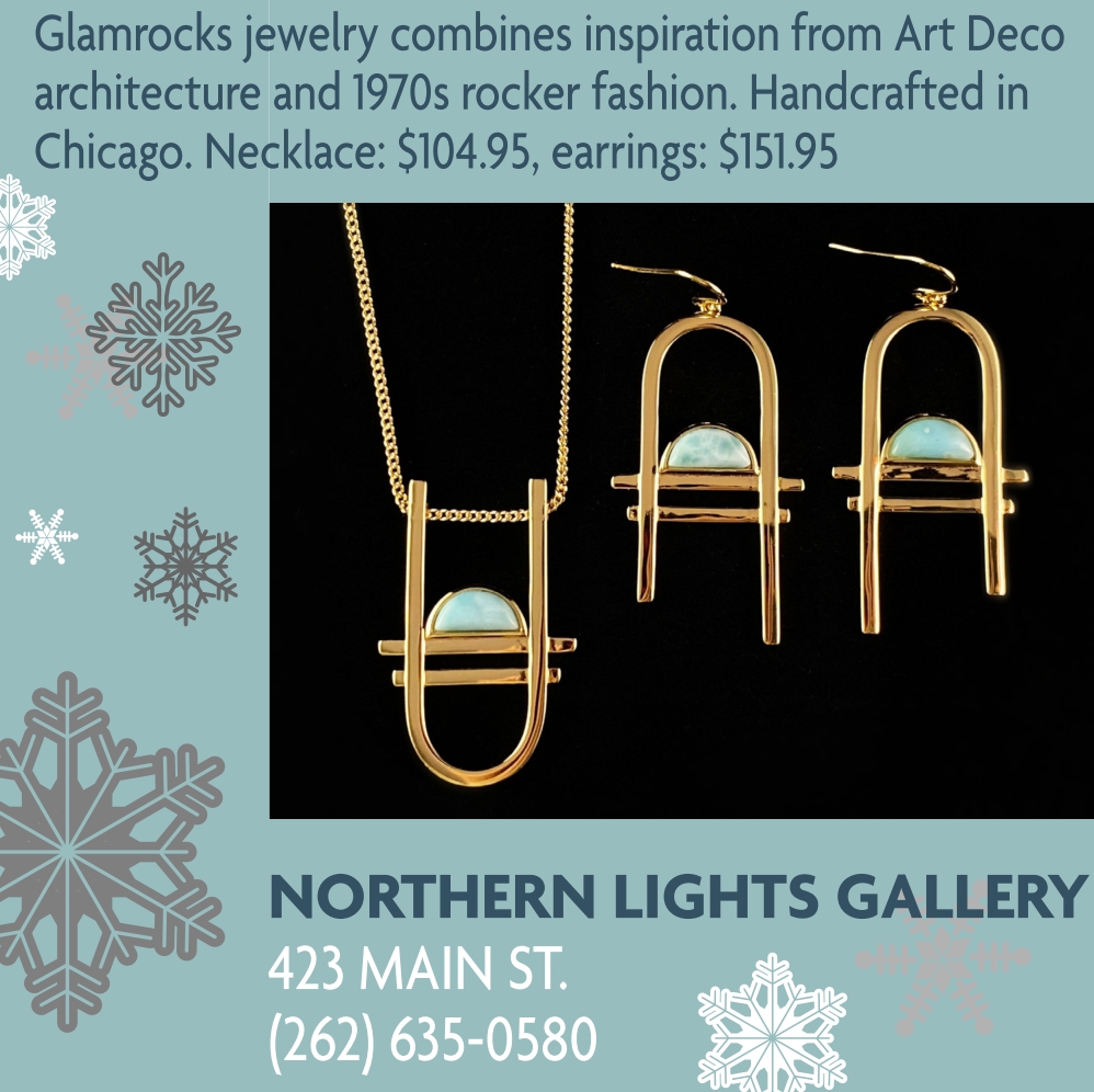 Glamrocks jewelry combines inspiration from Art Deco architecture and 1970s rocker fashion. Handcrafted in Chicago. Necklace: $104.95, earrings: $151.95 NORTHERN LIGHTS GALLERY 423 MAIN ST. (262) 635-0580 See also