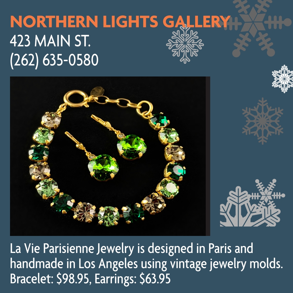 NORTHERN LIGHTS GALLERY 423 MAIN ST. (262) 635-0580 La Vie Parisienne Jewelry is designed in Paris and handmade in Los Angeles using vintage jewelry molds. Bracelet: $98.95, Earrings: $63.95 See also