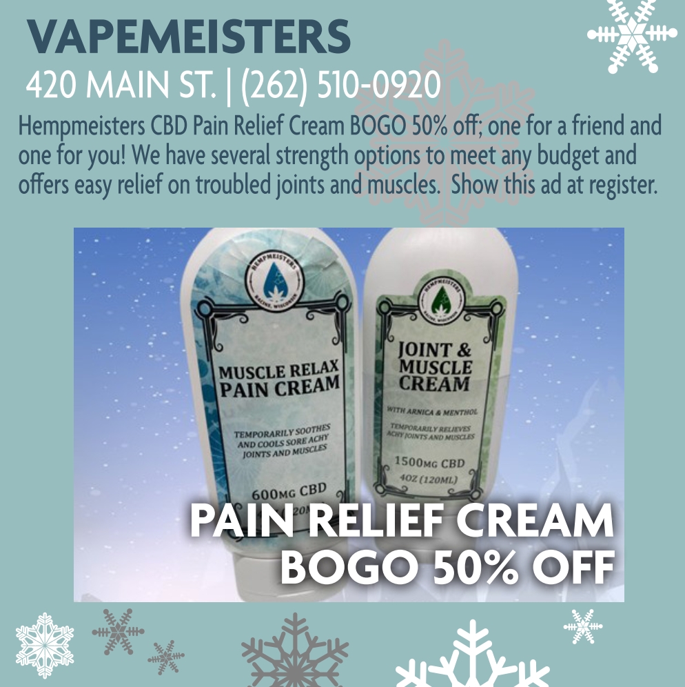 Hempmeisters CBD Pain Relief Cream BOGO 50% off; one for a friend and one for you! We have several strength options to meet any budget and offers easy relief on troubled joints and muscles. Show this ad at register.