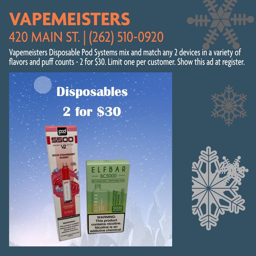 Vapemeisters Disposable Pod Systems mix and match any 2 devices in a variety of flavors and puff counts - 2 for $30. Limit one per customer. Show this ad at register.
