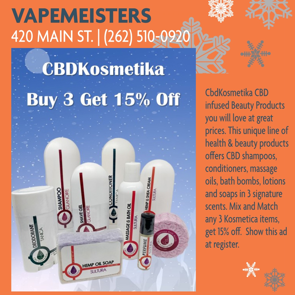 CbdKosmetika CBD infused Beauty Products you will love at great prices. This unique line of health & beauty products offers CBD shampoos, conditioners, massage oils, bath bombs, lotions and soaps in 3 signature scents. Mix and Match any 3 Kosmetica items, get 15% off. Show this ad at register.
