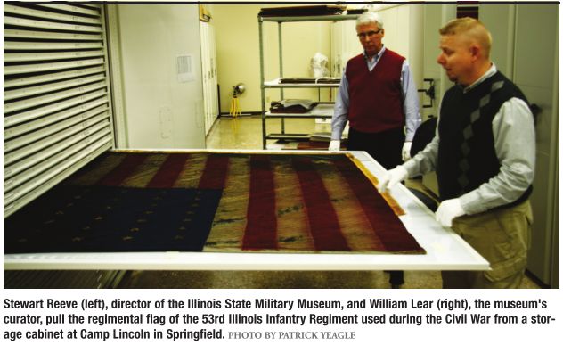 But private groups can raise money for restoration, Lear says, and the museum is happy to send the flags for restoration. One recent example is the flag of the 95th Illinois Infantry, which is on display at the Old State Capitol after the Boone County Historical Society and the McHenry County Civil War Round Table raised $40,000 to conserve it.
