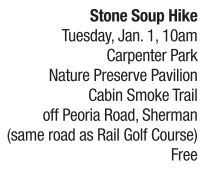 What better way to say hello to the New Year than a hike and time spent in the great outdoors with friends who share a love of nature. Join the Sangamon Valley Group of the Sierra Club on a New Year’s Day hike and feast of soup. Remember the children’s book Stone Soup? Well, there’s no stone necessary in this pot– participants are asked to bring one ingredient for the meat pot and one for the veggie pot, plus their own bowl and silverware. The club welcomes everyone to this invigorating morning meet-up. Membership in the group is only $39 per year. Visit illinois.sierraclub.org for details.