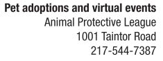 Join the Animal Protective League (APL) during July for an entire month of adoption events and fun virtual activities. You can enter a photo of your pet in the Online Christmas Costume Contest or join in the virtual Cool Down with Dogs celebrity fundraiser. If you are looking for a new feline friend, you can make an appointment any time during the month for the Cats in Hats adoption specials or visit the shelter on July 24 and 25 to adopt a kitten during the Kringle’s Kittens event. All animals available for adoption will be spayed or neutered, microchipped and will have received all age-appropriate vaccinations by the time of their adoption. Pets are also available for viewing and adoption daily by appointment only at the shelter. APL is a nonprofit organization dedicated to ending the euthanasia of healthy, adoptable animals by offering frequent adoption opportunities and vaccination, spaying and neutering programs. For additional information, call 217-544-7387 or visit their website at apl-shelter.org.