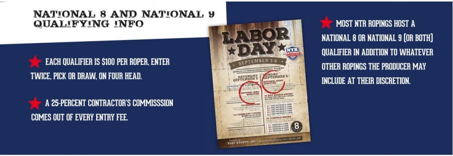 EACH QUALIFIER IS $100 PER ROPER, ENTER TWICE, PICK OR DRAW, ON FOUR HEAD. MOST NTR ROPINGS HOST A NATIONAL 8 OR NATIONAL 9 (OR BOTH) QUALIFIER IN ADDITION TO WHATEVER OTHER ROPINGS THE PRODUCER MAY INCLUDE AT THEIR DISCRETION. A 25-PERCENT CONTRACTOR’S COMMISSSION COMES OUT OF EVERY ENTRY FEE.